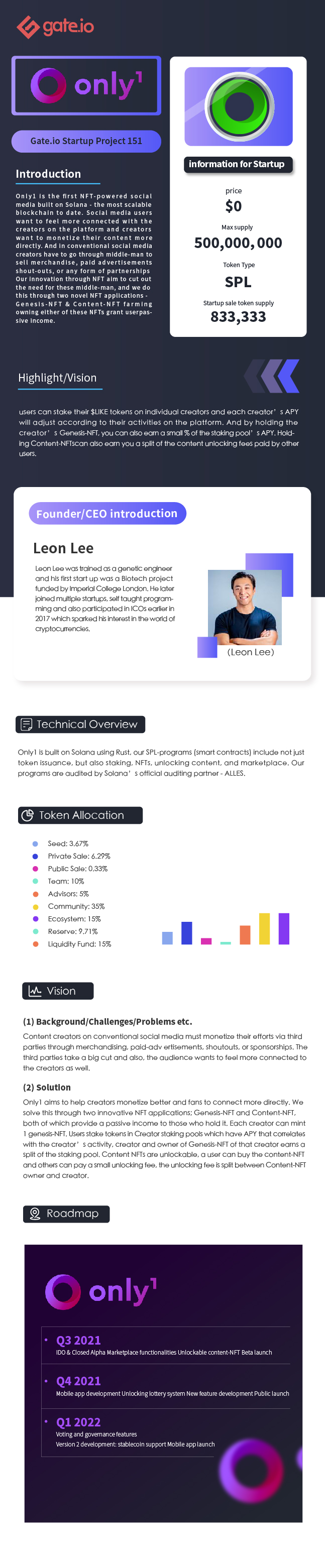 Only1 is the first NFT-powered social media built on Solana - the most scalable blockchain to date. Social media users want to feel more connected with the creators on the platform and creators want to monetize their content more directly. And in conventional social media, creators have to go through middle-man to sell merchandise, paid advertisements, shout-outs, or any form of partnerships. Our innovation through NFT aim to cut out the need for these middle-man, and we do this through two novel NFT applications - Genesis-NFT & Content-NFT farming, owning either of these NFTs grant user passive income.